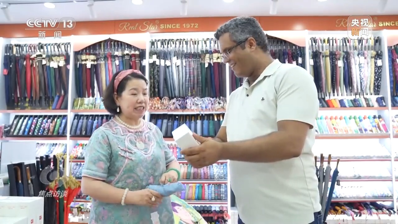 張吉英是義烏小商品市場(chǎng)的一位傘具經(jīng)營(yíng)戶。今年,她店鋪里一款經(jīng)過(guò)創(chuàng)新設(shè)計(jì)的防曬傘,在國(guó)外掀起了一股流行風(fēng)潮,與國(guó)內(nèi)消費(fèi)者追求防曬傘小巧輕便不同,國(guó)外客戶更偏愛(ài)大尺寸款式。比如在中東地區(qū),人們喜歡雨傘里面能?chē)娝F的款式,以追求更好的降溫體驗(yàn)。