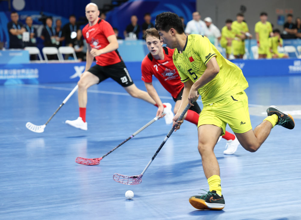 8月10日,中國(guó)隊(duì)球員張志恒(前)在比賽中帶球進(jìn)攻。當(dāng)日,在2025年成都世運(yùn)會(huì)軟式曲棍球男子B組預(yù)賽中,中國(guó)隊(duì)不敵加拿大隊(duì)。新華社記者 梁旭 攝