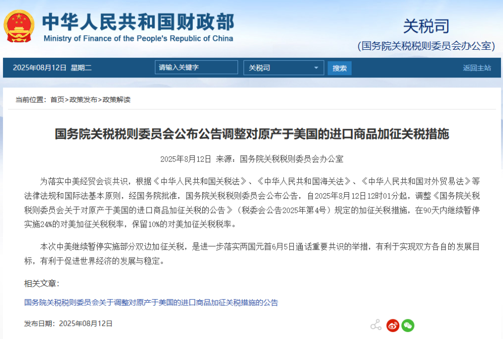 為落實中美經(jīng)貿(mào)會談共識,根據(jù)《中華人民共和國關(guān)稅法》、《中華人民共和國海關(guān)法》、《中華人民共和國對外貿(mào)易法》等法律法規(guī)和國際法基本原則,經(jīng)國務(wù)院批準(zhǔn),國務(wù)院關(guān)稅稅則委員會公布公告,自2025年8月12日12時01分起,調(diào)整《國務(wù)院關(guān)稅稅則委員會關(guān)于對原產(chǎn)于美國的進(jìn)口商品加征關(guān)稅的公告》(稅委會公告2025年第4號)規(guī)定的加征關(guān)稅措施,在90天內(nèi)繼續(xù)暫停實施24%的對美加征關(guān)稅稅率,保留10%的對美加征關(guān)稅稅率。