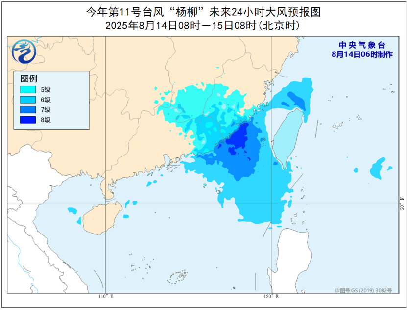 8月14日08時至15日08時,東海南部、臺灣海峽、南海東北部、巴士海峽、臺灣島北部和南部沿海、福建中南部及沿海、廣東東部及沿海、江西南部將有5~7級風,其中福建南部沿海、廣東東部沿海、臺灣海峽南部海域風力可達8級、陣風9~10級。