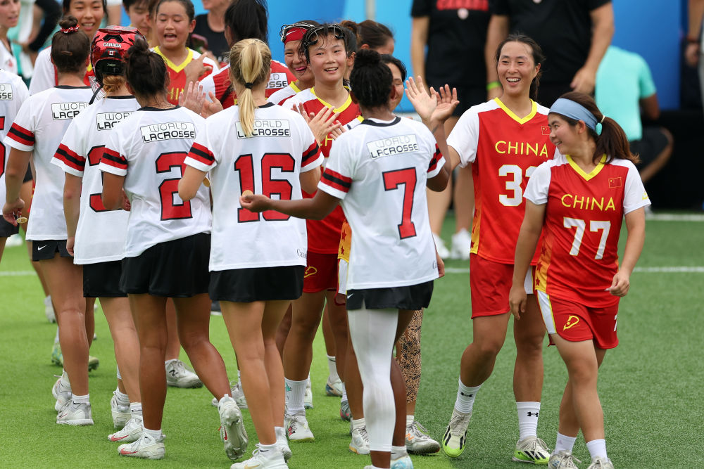 8月9日,中國(guó)棍網(wǎng)球隊(duì)球員與加拿大隊(duì)球員賽后擊掌致意。新華社記者 陳斌 攝