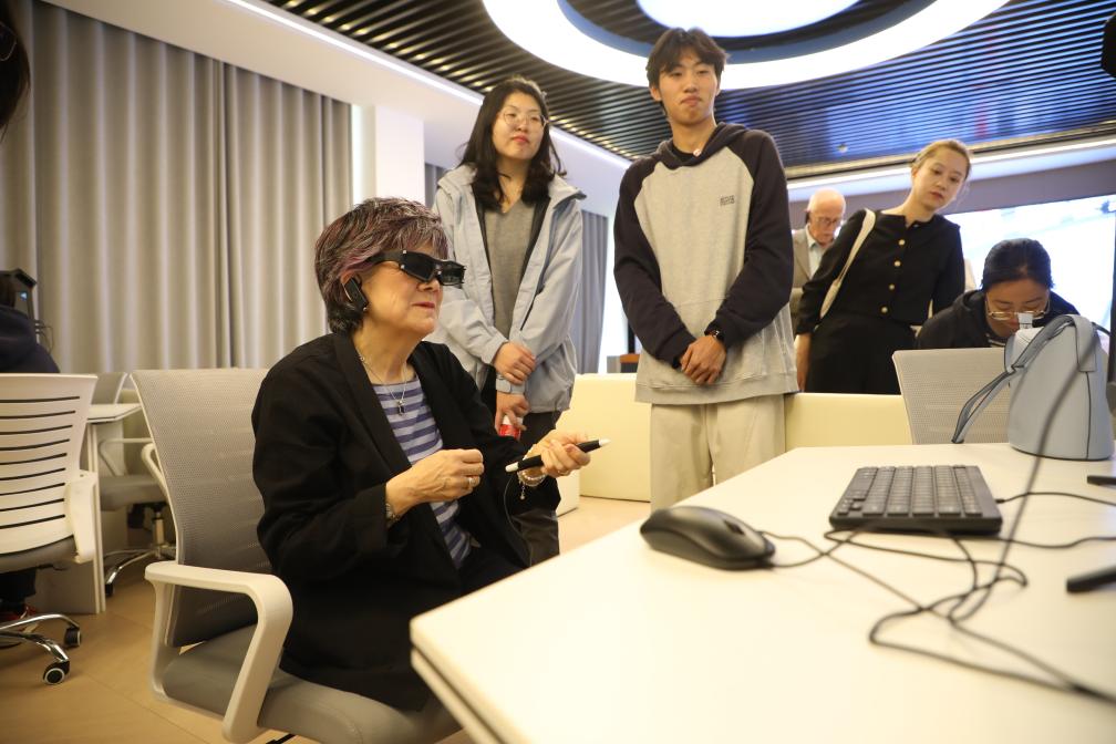 4月15日,在培黎職業(yè)學(xué)院,英中了解協(xié)會(huì)榮譽(yù)主席佐伊·里德體驗(yàn)學(xué)生們親手設(shè)計(jì)搭建的虛擬現(xiàn)實(shí)場景模型。新華社記者 張智敏 攝