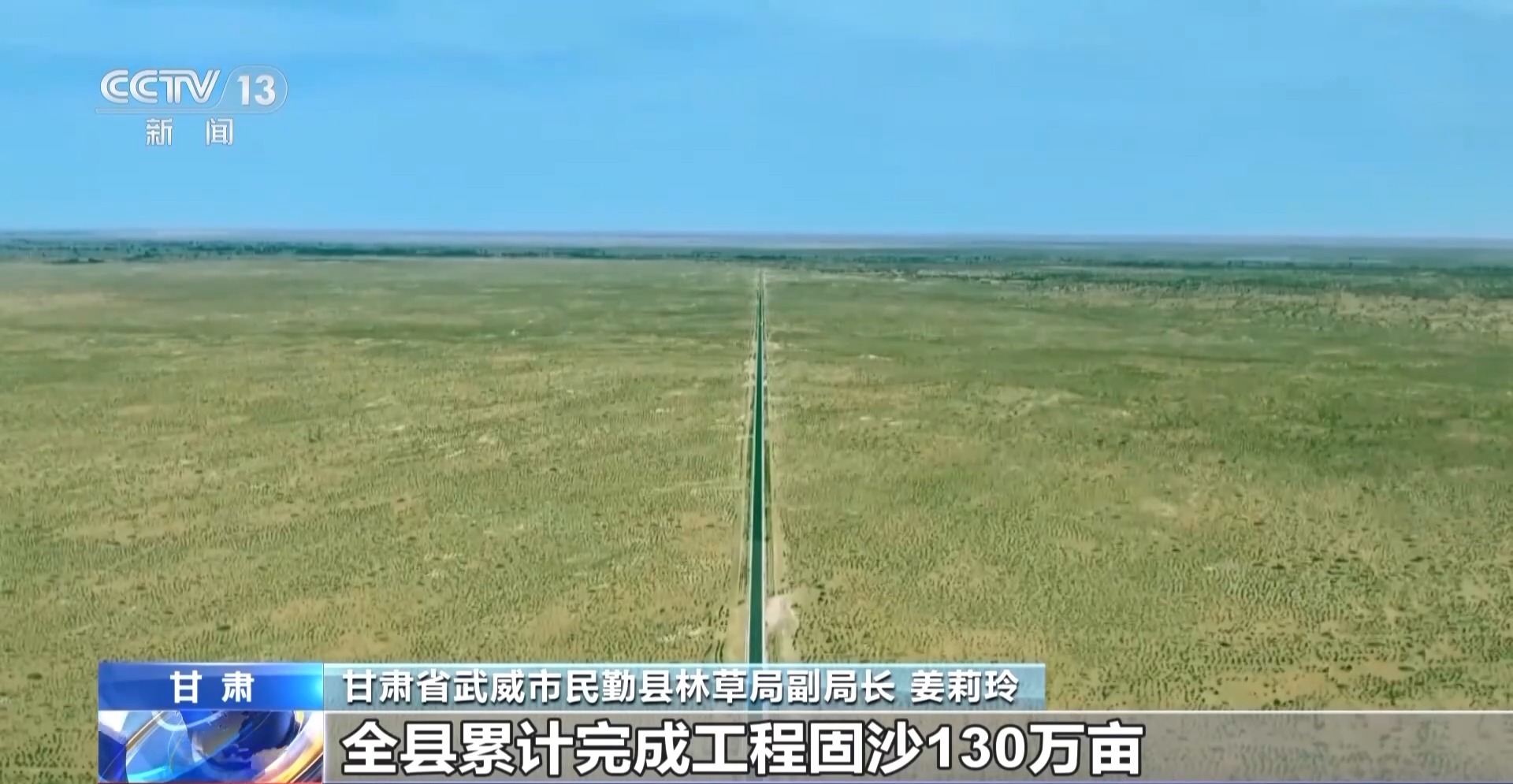 甘肅省武威市民勤縣林草局副局長 姜莉玲:截至目前,全縣累計完成工程固沙130萬畝,封沙育林草325萬畝,人工造林保存面積261萬畝。
