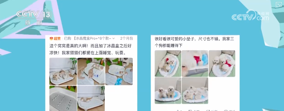 高溫還催熱了“它經(jīng)濟(jì)”。在網(wǎng)購平臺上搜索關(guān)鍵詞“寵物降溫”,寵物空調(diào)房、冰墊、冰絲圍巾、寵物專用空調(diào)等商品琳瑯滿目。一件30塊錢左右的基礎(chǔ)款寵物冰墊,月銷量輕松破萬??烧{(diào)節(jié)風(fēng)速的寵物風(fēng)扇、能自動制冷的寵物窩等,同樣備受追捧。評論區(qū)的畫風(fēng)是這樣的“狗狗非常喜歡,玩得不亦樂乎”“貓咪睡覺終于踏實(shí)了”“家里的娃和毛孩子都很喜歡”。