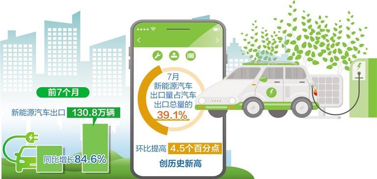 值得一提的是,新能源汽車出口數量增長明顯。前7個月,新能源汽車出口130.8萬輛,同比增長84.6%,成為外貿增長的亮點。