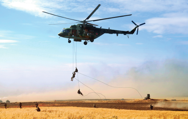 在俄羅斯奧倫堡州東古茲靶場(chǎng)舉行的“和平使命-2021”上海合作組織聯(lián)合反恐軍事演習(xí)實(shí)兵實(shí)彈演習(xí)中,多國(guó)聯(lián)合部隊(duì)特戰(zhàn)分隊(duì)執(zhí)行索降作戰(zhàn)任務(wù)(資料照片)梅世雄攝 / 本刊