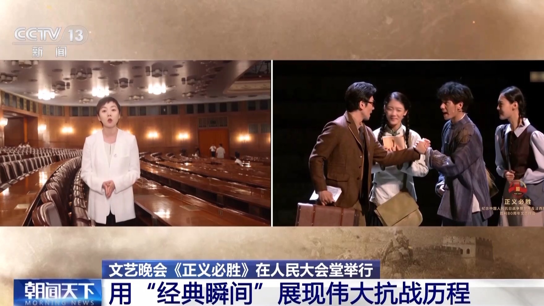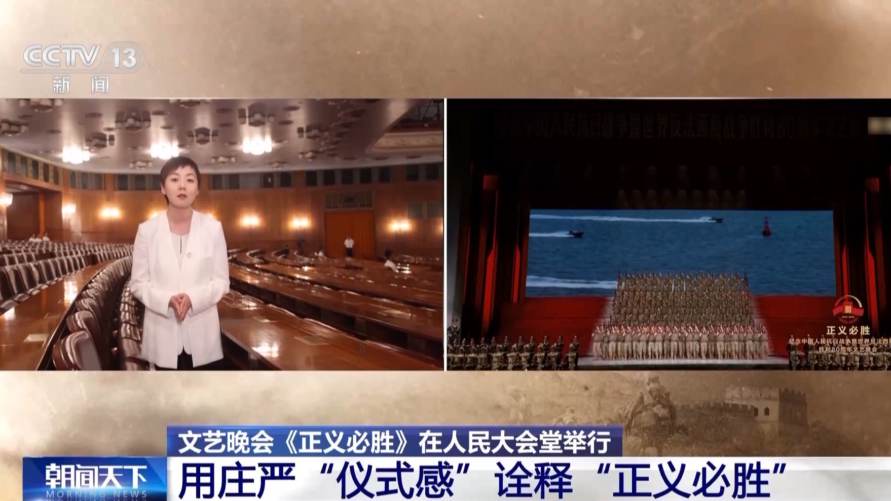 總臺央視記者 曹巖:從八月起我們一直在現(xiàn)場跟蹤記錄抗戰(zhàn)勝利80周年紀(jì)念晚會的排練,我個人覺得這場晚會最大的特征,就是在里面我們看到的不是一個又一個的獨立節(jié)目,而是一整部的情景史詩劇。
