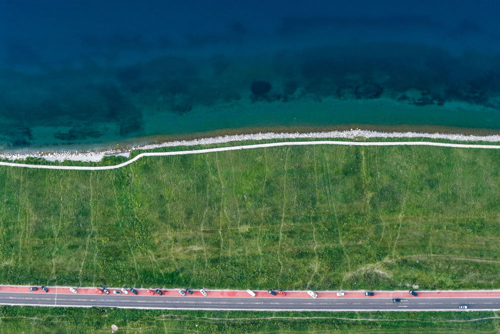 ↑ 游客駕車行駛在賽里木湖景區(qū)(無人機照片,7月8日攝)。