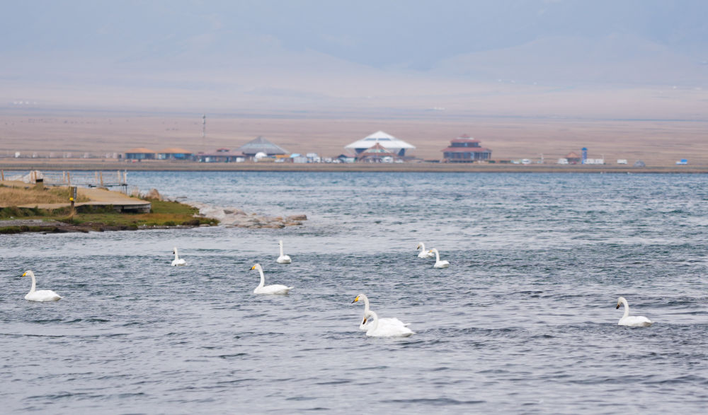 ↑ 9月10日,天鵝在賽里木湖游弋。