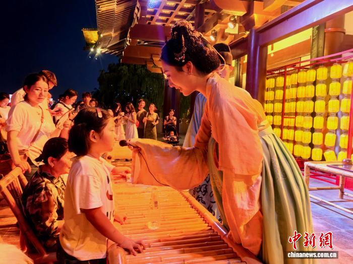 9月5日,長沙杜甫江閣“喜相逢”唐風互動夜游活動中,演員正在與觀眾互動。張雪盈 攝