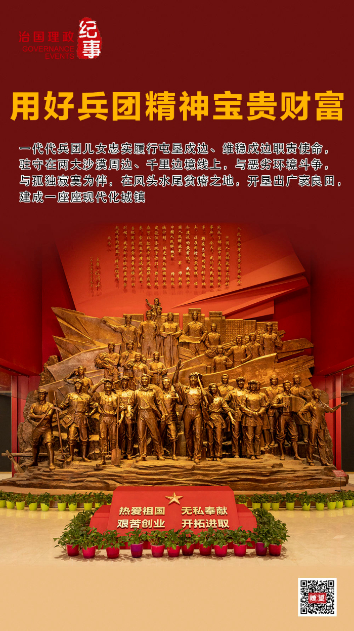 ◇2022年7月,習(xí)近平總書記在新疆考察時(shí)來(lái)到新疆生產(chǎn)建設(shè)兵團(tuán)八師石河子市,參觀新疆兵團(tuán)軍墾博物館。會(huì)見兵團(tuán)老中青三代建設(shè)者代表時(shí),他強(qiáng)調(diào),新疆生產(chǎn)建設(shè)兵團(tuán)為推動(dòng)新疆發(fā)展、增進(jìn)民族團(tuán)結(jié)、維護(hù)社會(huì)穩(wěn)定、鞏固國(guó)家邊防作出了不可磨滅的貢獻(xiàn)。兵團(tuán)人鑄就的熱愛祖國(guó)、無(wú)私奉獻(xiàn)、艱苦創(chuàng)業(yè)、開拓進(jìn)取的兵團(tuán)精神,是中國(guó)共產(chǎn)黨人精神譜系的重要組成部分,要用好這些寶貴財(cái)富。