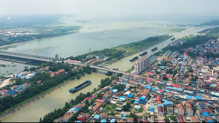 站在山東省濟寧市微山縣韓莊鎮(zhèn)的韓莊運河橋上遠(yuǎn)眺,一側(cè)是水天相接、煙波浩渺的微山湖,另一側(cè)是奔流千年、一路東去的大運河。