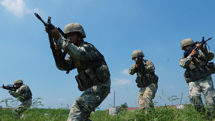 烈日灼人,汗水混雜著泥土粘在作訓(xùn)服上。但戰(zhàn)士們一絲不茍,目光如炬,動作凌厲,搜索、突擊、越障、匍匐……一舉一動彰顯著人民軍隊的凜然軍威與中國軍人的過硬本領(lǐng)。?