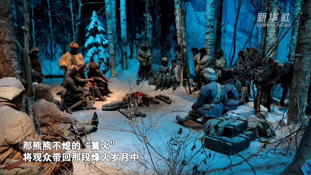 “九·一八”歷史博物館內(nèi),抗聯(lián)戰(zhàn)士密林宿營地的模擬場(chǎng)景吸引觀眾駐足,那熊熊不熄的“篝火”,將觀眾帶回那段烽火歲月中。