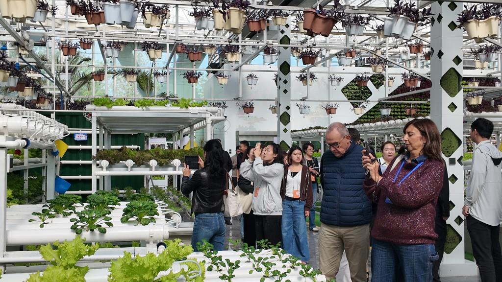 走進(jìn)昌吉新疆農(nóng)業(yè)博覽園內(nèi)的垂直農(nóng)業(yè)展示區(qū)、葉菜工廠示范區(qū)和果菜工廠示范區(qū),目睹無(wú)土栽培、無(wú)人機(jī)灌溉、光合作用智能調(diào)控等一系列農(nóng)業(yè)高科技應(yīng)用為作物“量身定制”生長(zhǎng)環(huán)境,參訪議員們紛紛拍照記錄。