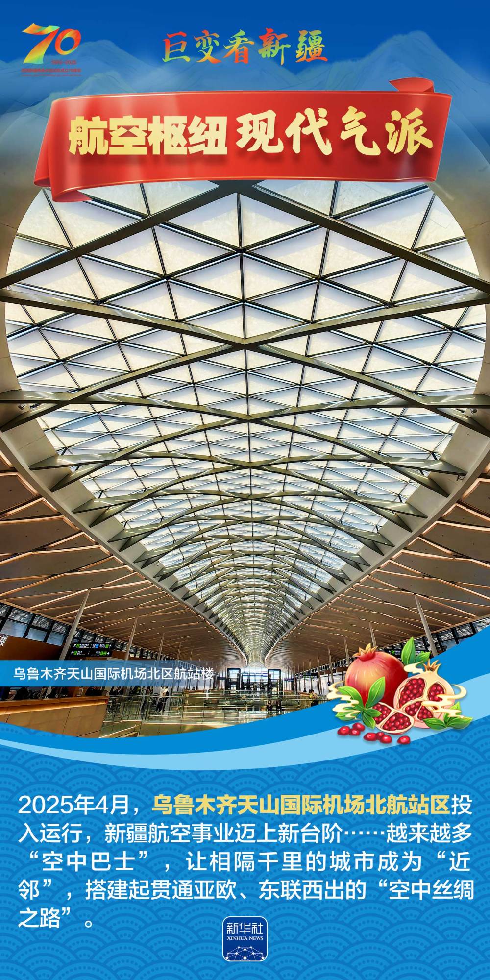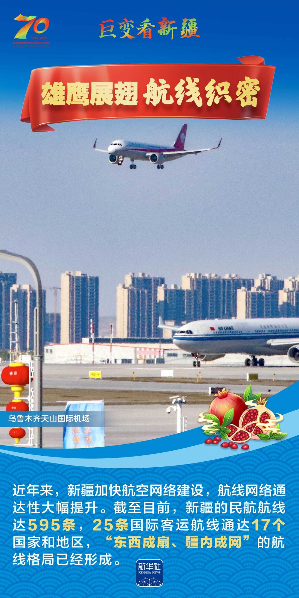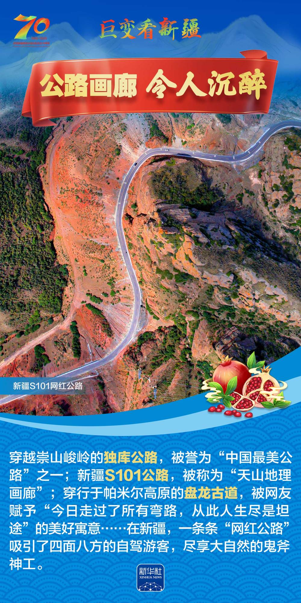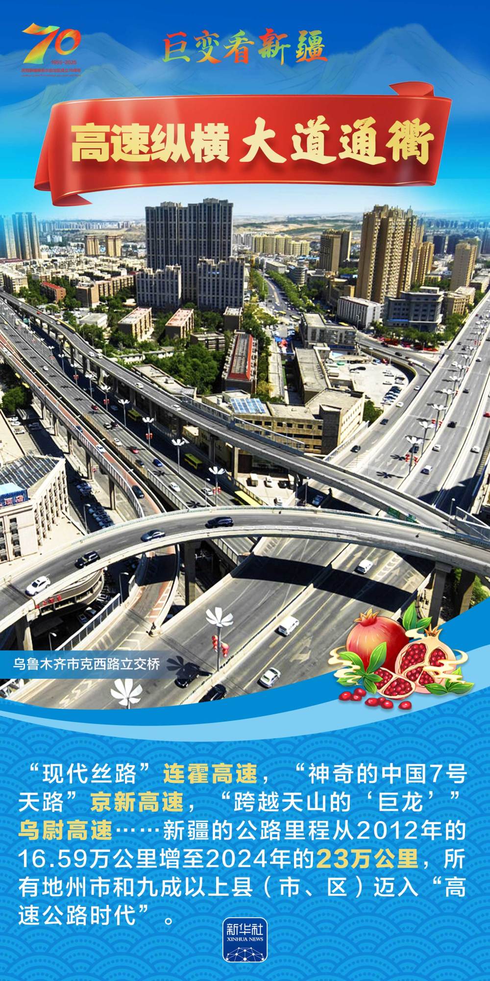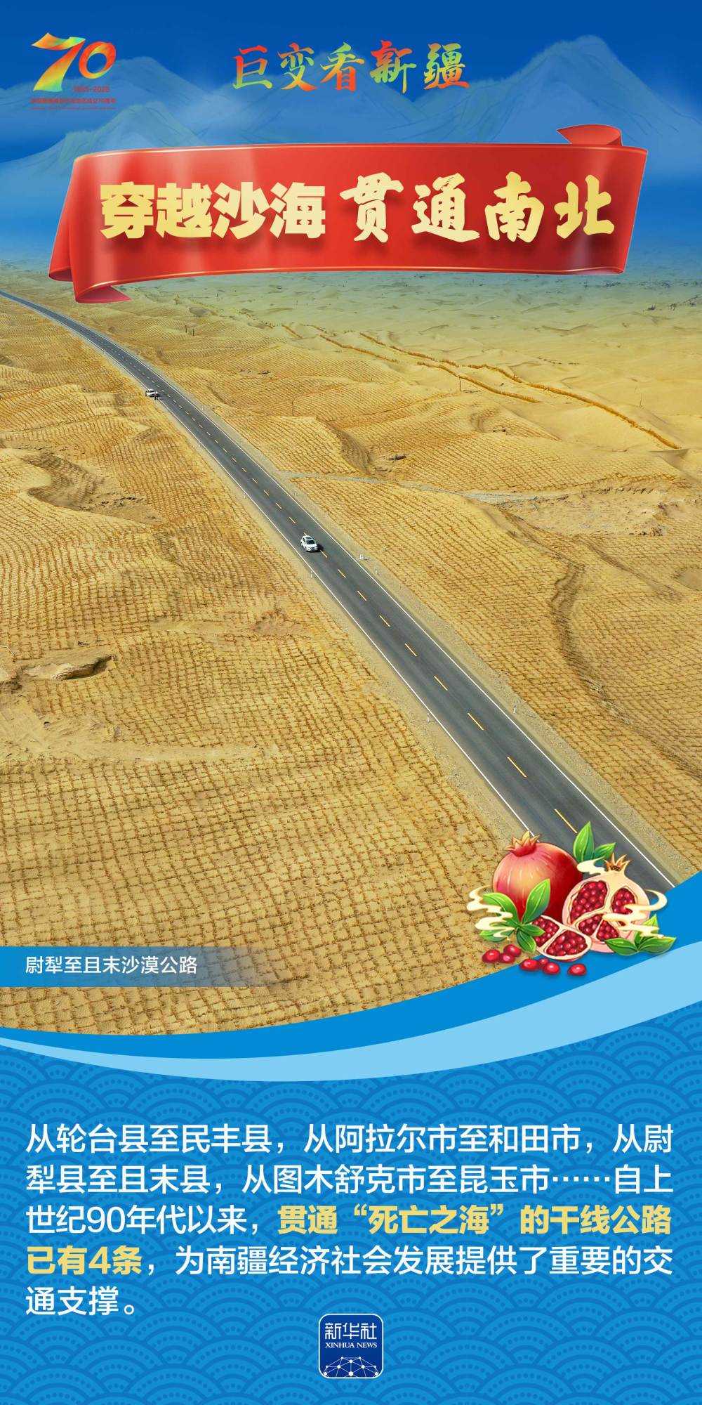 今年是新疆維吾爾自治區(qū)成立70周年。70年來(lái),新疆的交通建設(shè)日新月異。從駝鈴聲聲、馬蹄嘚嘚到鐵流縱橫、銀鷹高翔,一座座交通樞紐輻射四方,一條條“鋼鐵巨龍”蜿蜒逶迤,一個(gè)個(gè)支線機(jī)場(chǎng)星羅棋布,現(xiàn)代化的新疆立體交通網(wǎng)絡(luò)日益形成。讓我們跟隨這組海報(bào),一起見(jiàn)證穿越“三山兩盆”、貫通歐亞大陸的新時(shí)代新疆交通畫卷。