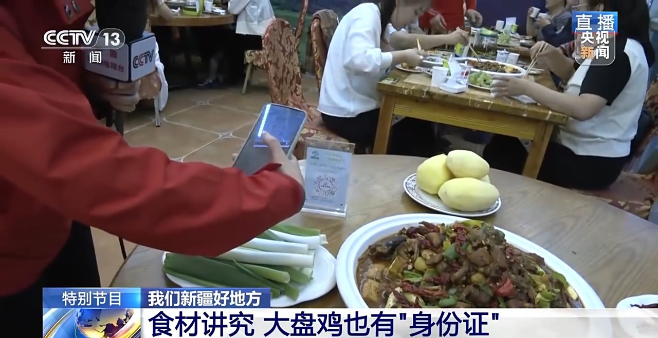 其實(shí),大盤雞里的每一種原料,都是新疆農(nóng)業(yè)發(fā)展的縮影。先說(shuō)這最主要的雞肉,是來(lái)自當(dāng)?shù)貥?biāo)準(zhǔn)化散養(yǎng)的土雞,這可不是一般的雞,它讓大盤雞有了“電子身份證”,我們來(lái)掃碼看看。