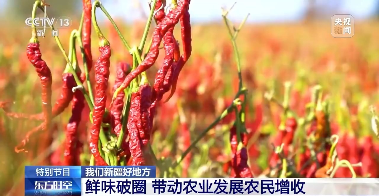 說(shuō)完了主角,再來(lái)說(shuō)說(shuō)配菜。這里面的土豆來(lái)自博爾通古鄉(xiāng)。最關(guān)鍵的辣椒,是當(dāng)?shù)氐闹饕r(nóng)作物,來(lái)自“辣椒之鄉(xiāng)”安集海鎮(zhèn)。過(guò)去這里的辣椒只是農(nóng)民零散種植,如今已經(jīng)形成了從育種、種植、加工到銷售的完整產(chǎn)業(yè)鏈。這些辣椒不僅給大盤雞“注入靈魂”,也滿足了全國(guó)的餐桌需求,還出口到韓國(guó)、日本等地。