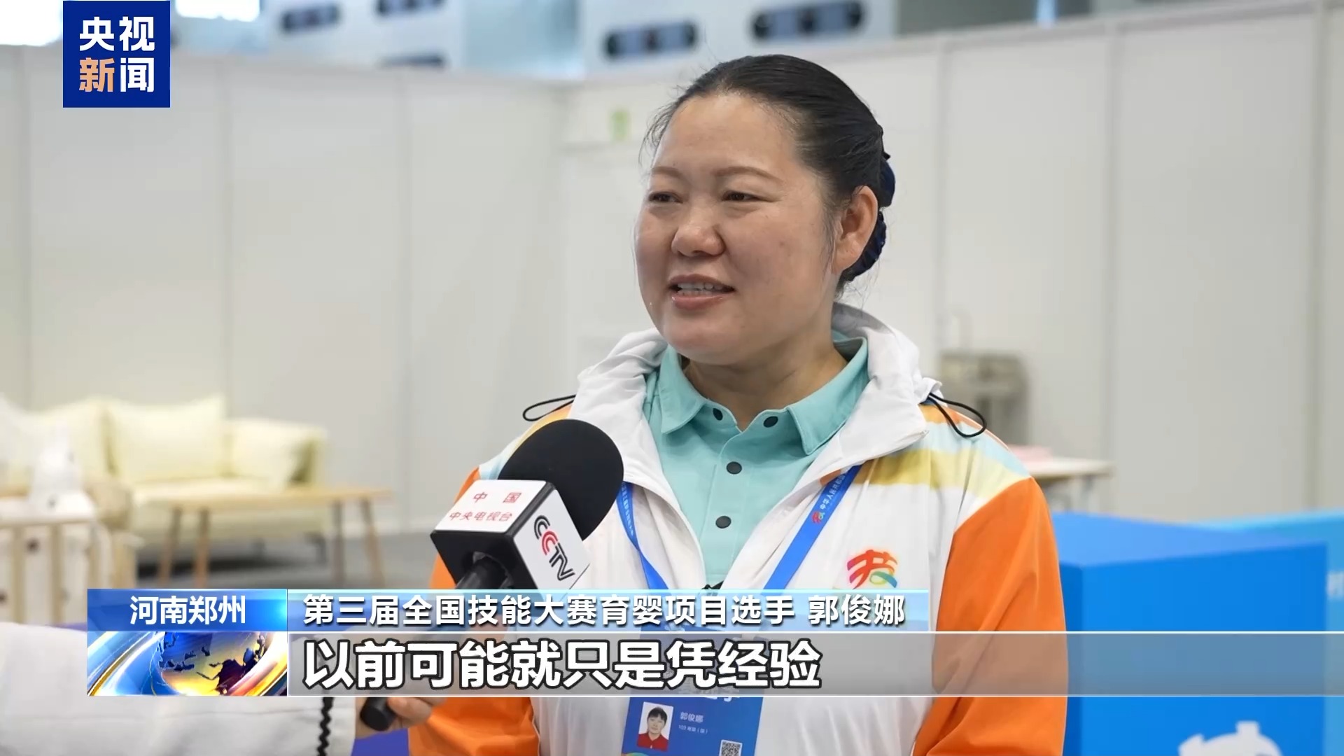 第三屆全國(guó)技能大賽育嬰項(xiàng)目選手 郭俊娜:比如給寶寶喂奶,以前可能只是憑經(jīng)驗(yàn),現(xiàn)在就要求抱孩子45度斜角。把流程標(biāo)準(zhǔn)化了,能夠更好地服務(wù)嬰幼兒以及家庭。