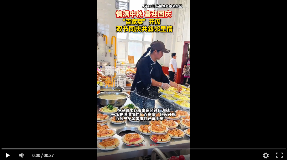 新疆廣播電視臺(tái)/絲路視聽訊 (記者:于美玲 李新剛 )中秋與國慶相擁,團(tuán)圓與歡歌同行。在烏魯木齊市米東區(qū)鐵廠溝鎮(zhèn),一場充滿鄉(xiāng)土溫情的“百家宴”熱鬧開席,百余戶鄉(xiāng)親帶著自己拿手家常菜赴約,用飯菜香、鄰里情,勾勒出雙節(jié)喜慶氛圍。