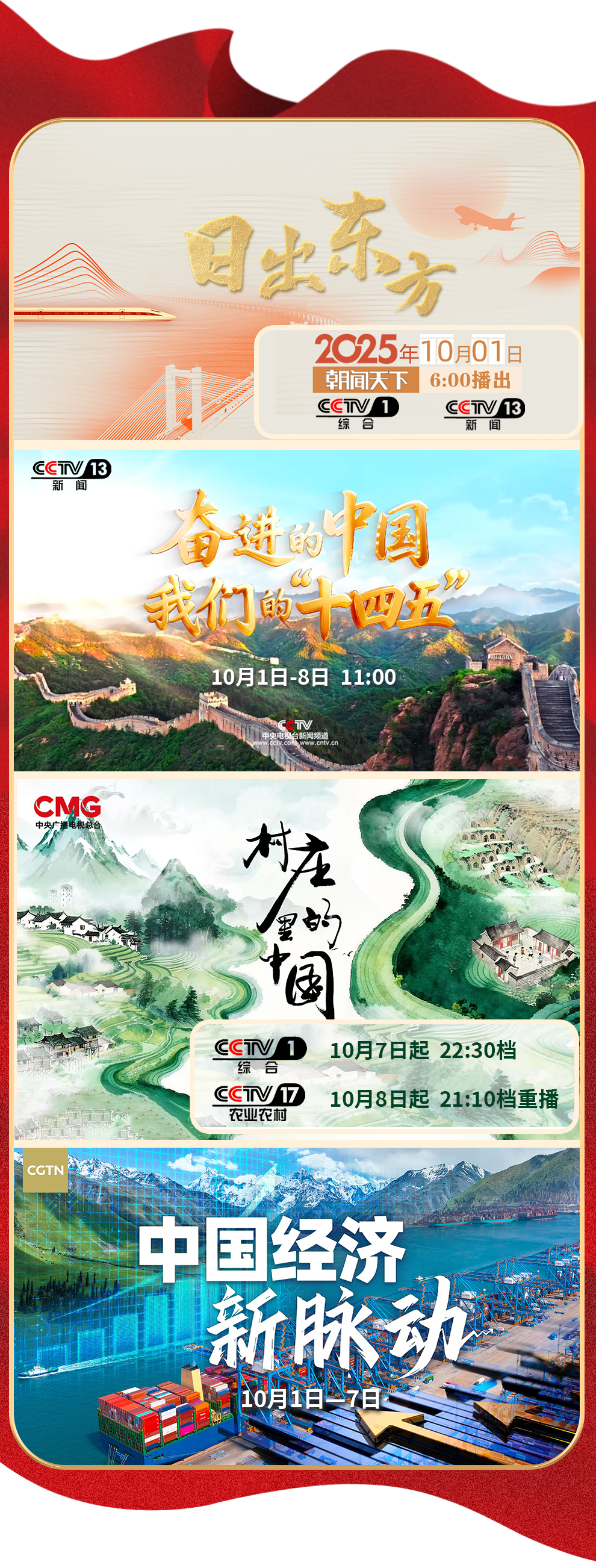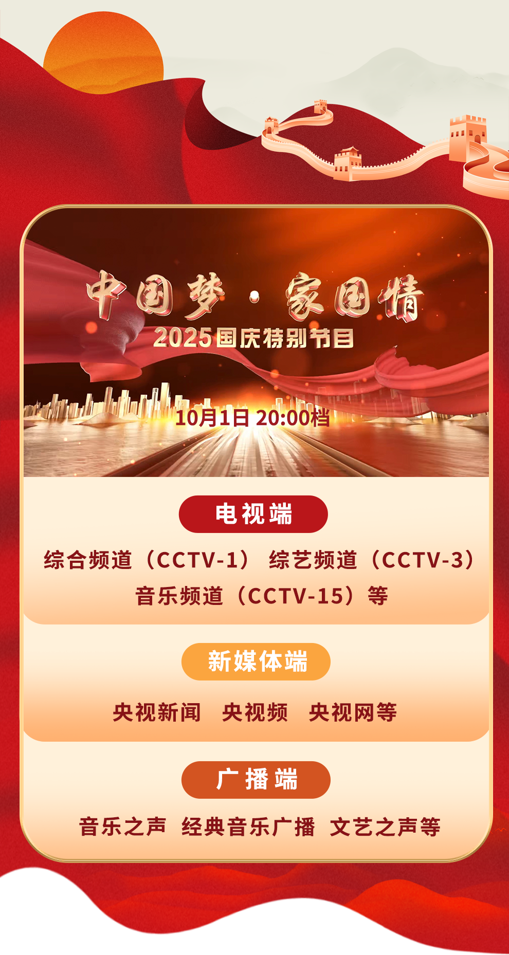 金秋潑彩山河醉,家國同輝氣象新。10月1日晚八點(diǎn),《中國夢 家國情——2025國慶特別節(jié)目》將在《我愛你中國》的大合唱中拉開大幕。特別節(jié)目走進(jìn)城市地標(biāo)與文化遺址,展現(xiàn)山河新貌與奮斗者群像。經(jīng)典曲目、交響合唱、新創(chuàng)歌曲傳遞濃濃家國情懷。抗戰(zhàn)老兵、奧運(yùn)冠軍、各行各業(yè)奮斗者深情講述……整場節(jié)目,洋溢著中華民族偉大復(fù)興勢不可擋的壯志豪情。