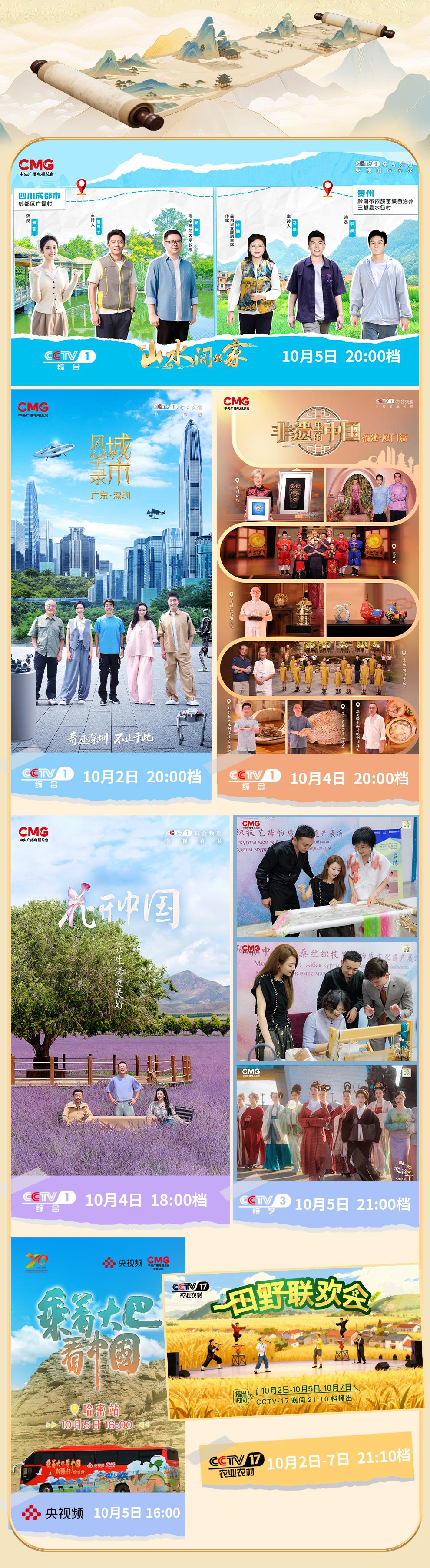 八天假期,想好去哪兒玩了嗎?來,跟著總臺去打卡!頭兩站:四川、貴州!《山水間的家(第四季)》“山水小分隊(duì)”邀你在川西林盤探韭香產(chǎn)業(yè),在黔南山鄉(xiāng)看巖椒成林。第三站:廣東。《城市風(fēng)華錄》帶你去深圳探訪全球首家機(jī)器人6S店,感受“奇跡之城”向新向好的澎湃動力。第四站:福建。珠繡、漆線雕、閩南童謠、高甲戲……看《非遺里的中國》,領(lǐng)略廈門非遺之美。第五站:新疆。從《花開中國》開啟一場跨越天山的芬芳之旅,在《衣錦天下 絲路季》發(fā)現(xiàn)絲綢之路上的中國審美,《乘著大巴游中國》探尋哈密甜美密碼。第六站:內(nèi)蒙古。在通遼參加《田野聯(lián)歡會》,體驗(yàn)鄉(xiāng)土文化新活力。這八天的旅程,你不會錯過雄奇的風(fēng)光、古老的文化、新奇的創(chuàng)造,還有熱氣騰騰的生活。