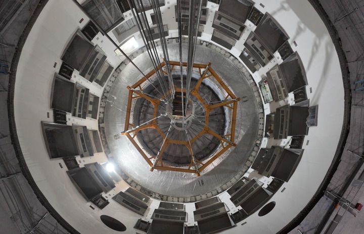 這是2025年10月1日在安徽合肥未來(lái)大科學(xué)城緊湊型聚變能實(shí)驗(yàn)裝置(BEST)建設(shè)現(xiàn)場(chǎng)拍攝的成功落位安裝的杜瓦底座(無(wú)人機(jī)照片)。新華社記者 周牧 攝