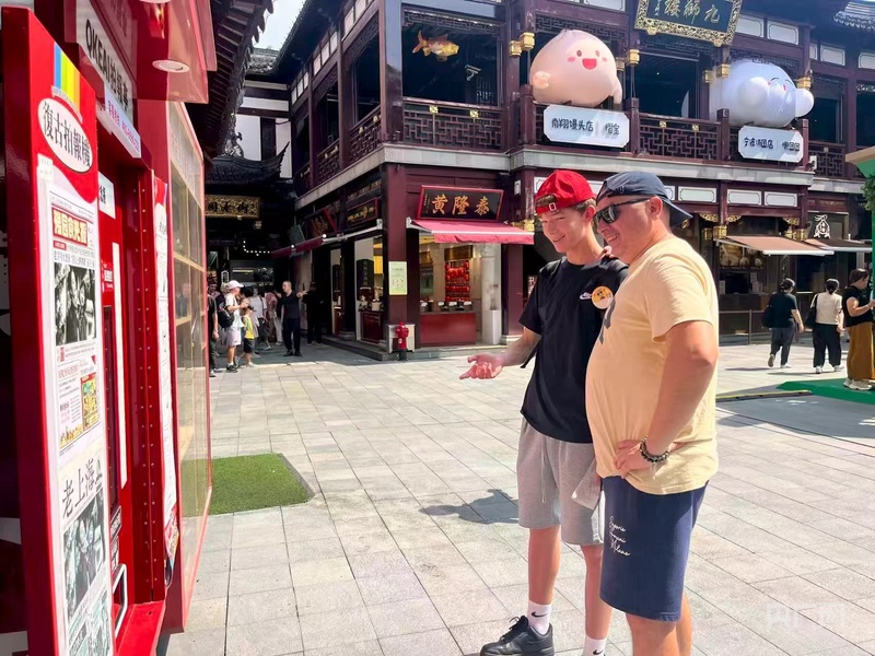 正在體驗(yàn)復(fù)古拍報(bào)機(jī)的俄羅斯父子 (央廣網(wǎng)記者 沈梅攝)
