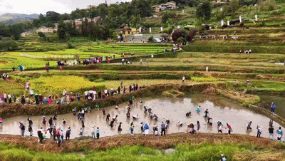 在云南省紅河州,元陽哈尼小鎮(zhèn)國慶假期舉辦了首屆哈尼梯田泥濘挑戰(zhàn)賽?!澳嗟貙殹薄疤萏锇魏印薄暗咎锊遏~”等項目趣味十足。300余名參賽選手們在梯田間奔跑,體驗別樣的農(nóng)耕樂趣。