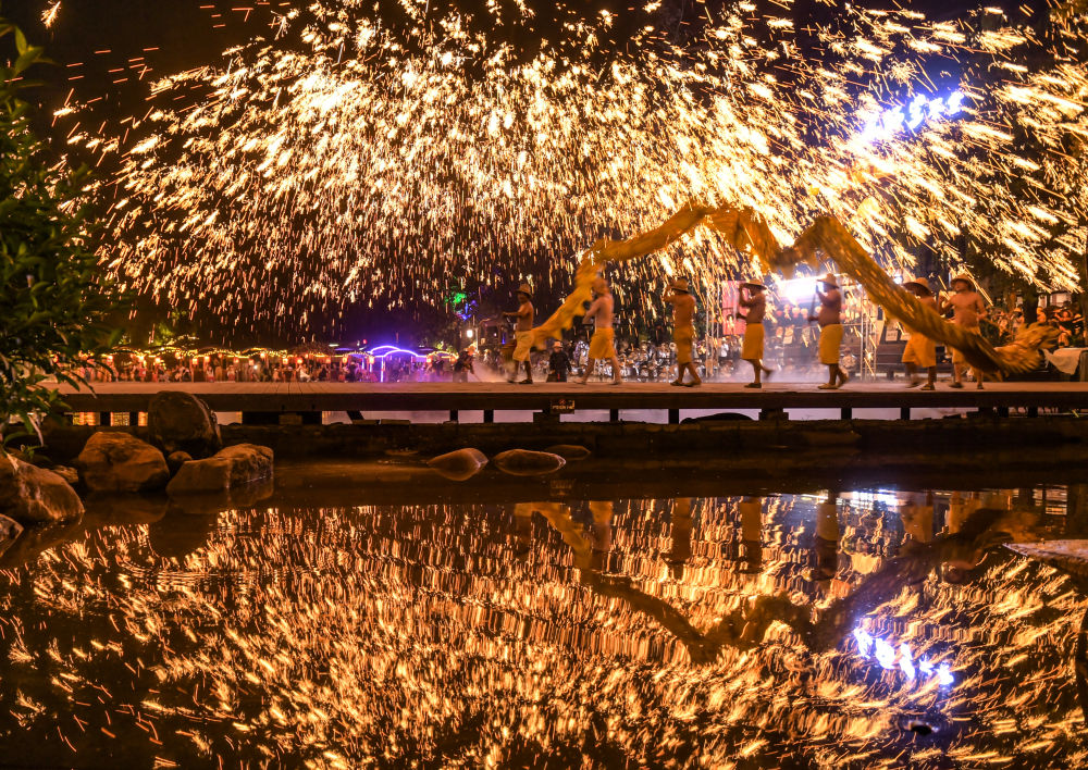 10月5日晚,在四川省成都市雙流區(qū)黃龍溪古鎮(zhèn),民間藝人為游客表演非遺“火龍燈舞”。新華社發(fā)(李向雨攝)