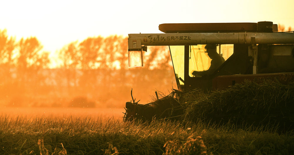 10月3日,農(nóng)戶在北大荒集團黑龍江八五六農(nóng)場有限公司第五管理區(qū)搶收水稻(無人機照片)。新華社發(fā)(黃永興攝)