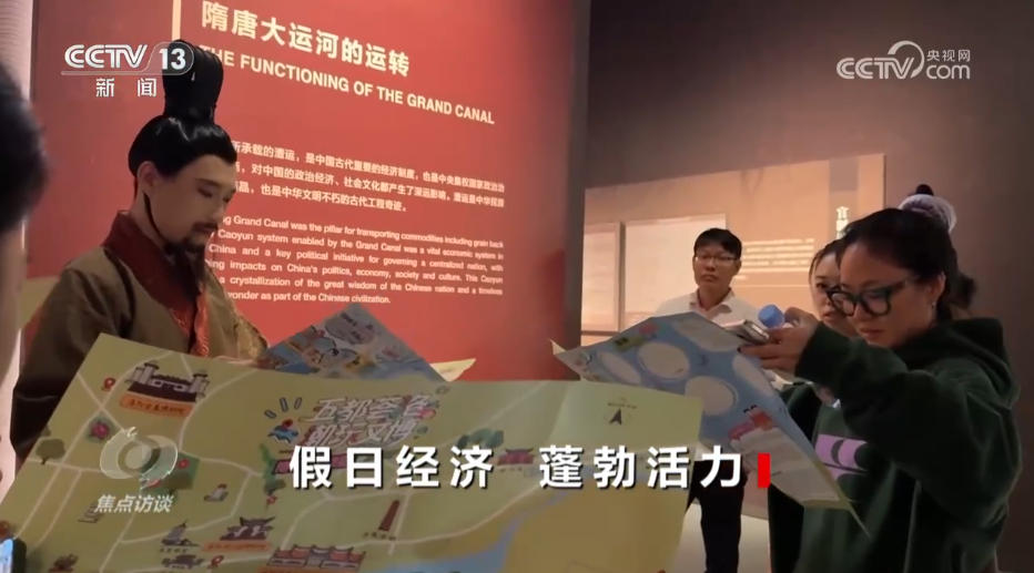 在河南洛陽(yáng)的隋唐大運(yùn)河文化博物館,一位身穿古裝的角色扮演者突然走向游客,簡(jiǎn)單自我介紹后,將特制的文博地圖送到大家手中,并邀請(qǐng)眾人一起漫步展廳,沉浸式探尋大運(yùn)河的前世今生。