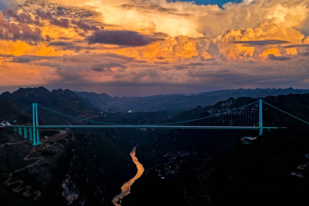 這是9月28日拍攝的夕陽下的貴州花江峽谷大橋(無人機(jī)照片)。新華社記者 楊文斌 攝