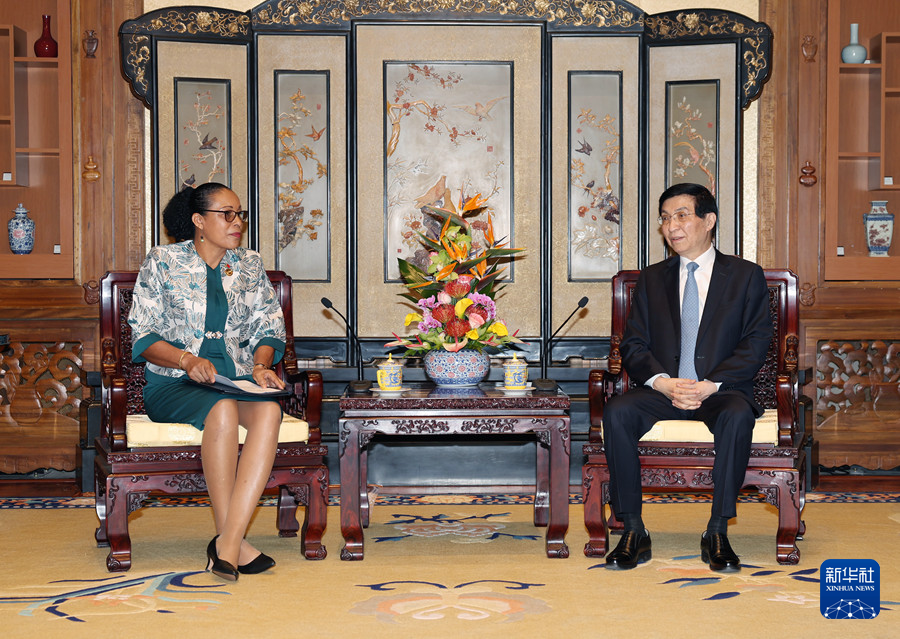 全國(guó)政協(xié)主席王滬寧14日在京會(huì)見(jiàn)來(lái)華出席全球婦女峰會(huì)的多米尼克總統(tǒng)伯頓。