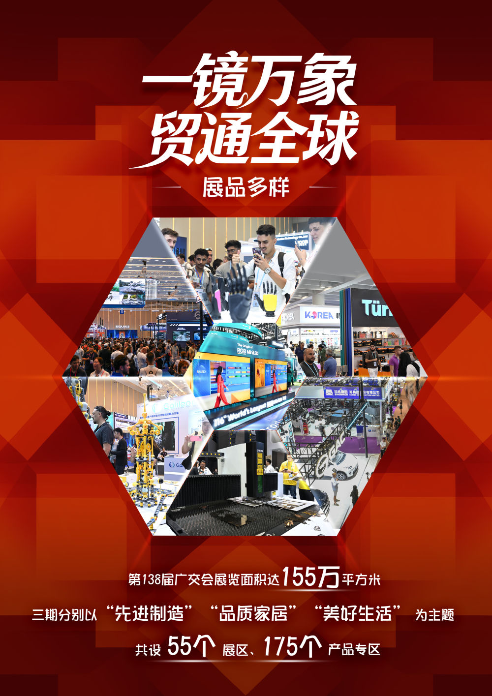 第138屆廣交會于10月15日至11月4日分三期在廣州舉辦,本屆廣交會展覽面積達155萬平方米。展位總數(shù)7.46萬個,參展企業(yè)超3.2萬家,均創(chuàng)歷史新高,約3600家企業(yè)首次亮相。