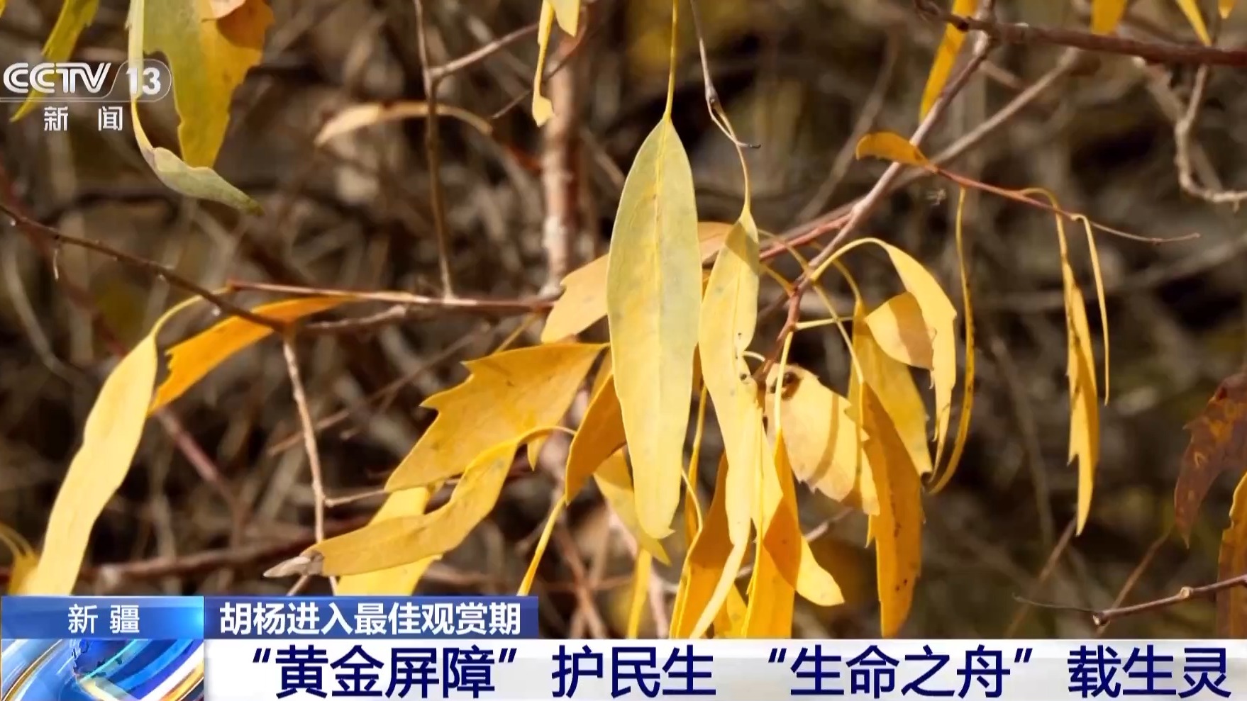 總臺記者 周宇:新疆沙雅縣擁有著全世界面積最大的野生胡楊林。這里的胡楊林進入了最佳的觀賞時期。當(dāng)我們走近胡楊,會發(fā)現(xiàn)同一棵樹上擁有著不同形狀的葉子: