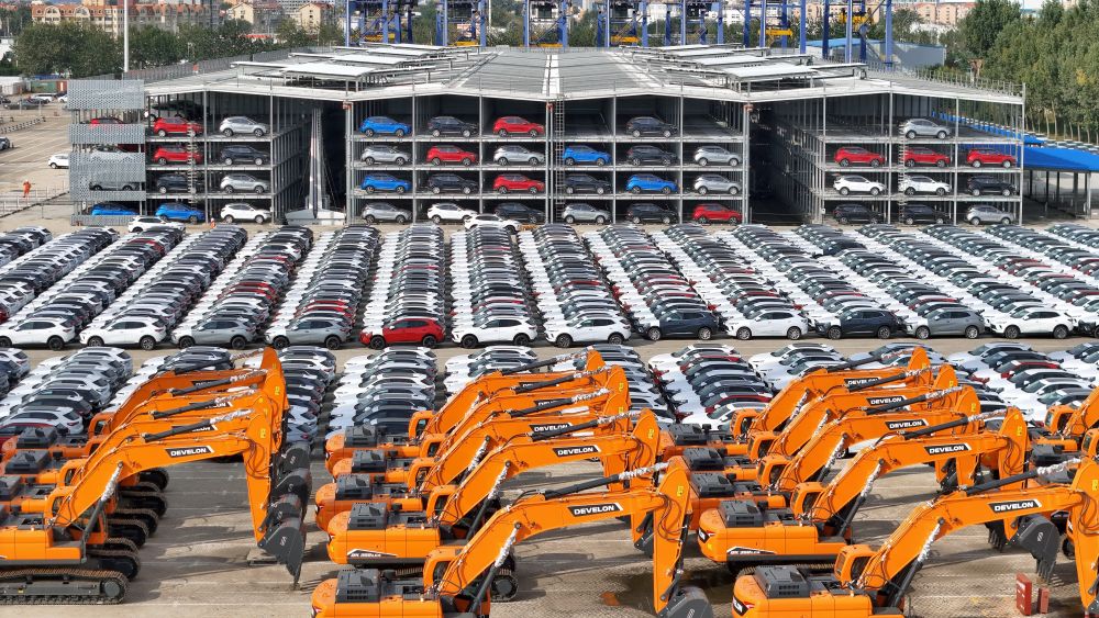 10月20日,國產(chǎn)汽車和工程機(jī)械在山東港口煙臺(tái)港集結(jié)等待裝船出口(無人機(jī)照片)。新華社發(fā)(唐克 攝)