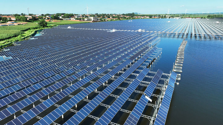 2025年7月30日在遼寧省鐵嶺市鐵嶺縣大青水庫拍攝的光伏發(fā)電板(無人機(jī)照片)。新華社記者 楊青 攝