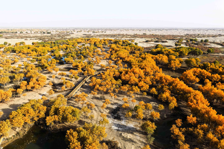 這是2025年10月19日拍攝的新疆和田地區(qū)洛浦縣洛濱胡楊林景區(qū)風(fēng)光(無人機(jī)照片)。新華社記者 辛悅衛(wèi) 攝