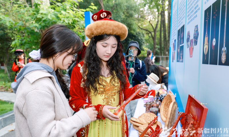 10月27日下午,南京師范大學(xué)(隨園校區(qū))學(xué)生在欣賞新疆樂(lè)器。石榴云/新疆日?qǐng)?bào)記者 甘興華攝