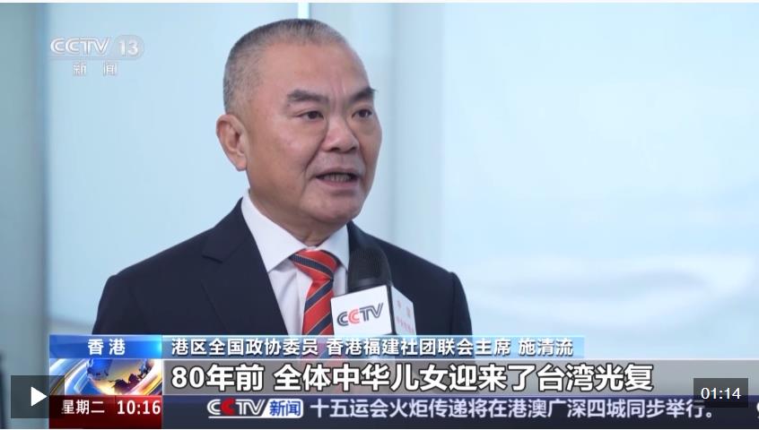 港區(qū)全國政協(xié)委員 香港福建社團聯(lián)會主席 施清流:80年前,全體中華兒女迎來臺灣光復(fù),回歸祖國的歷史性時刻,這一偉大勝利值得兩岸同胞銘記。香港各界將銘記歷史,以實際行動推動兩岸交流合作,為助力國家發(fā)展大局貢獻力量,共創(chuàng)中華民族偉大復(fù)興的美好未來。