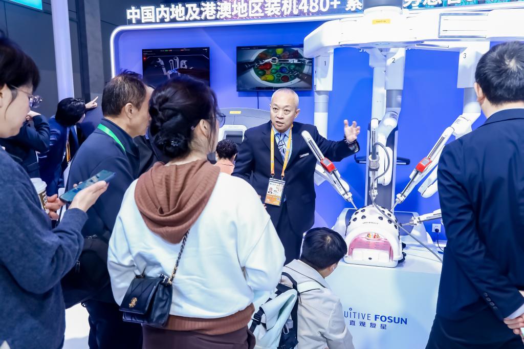 手術(shù)機器人是各家跨國醫(yī)療行業(yè)企業(yè)展示數(shù)智創(chuàng)新、產(chǎn)業(yè)協(xié)作的重頭戲。作為每年醫(yī)療展區(qū)的“明星展品”,八赴進博的達芬奇手術(shù)機器人今年首次集齊“全家?!?。