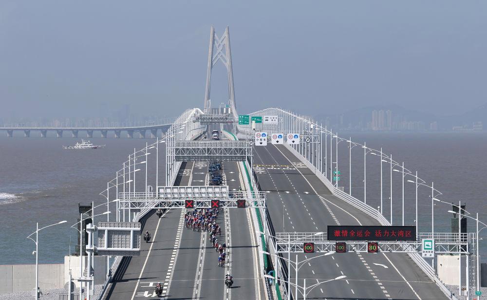 11月8日,在第十五屆全國運動會公路自行車男子個人賽決賽中,參賽選手在港珠澳大橋騎行。新華社記者梁旭 攝