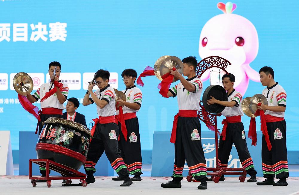 11月11日,粵港澳聯隊在第十五屆全國運動會群眾展演舞龍舞獅南獅自選項目決賽比賽中。新華社記者 王鵬 攝