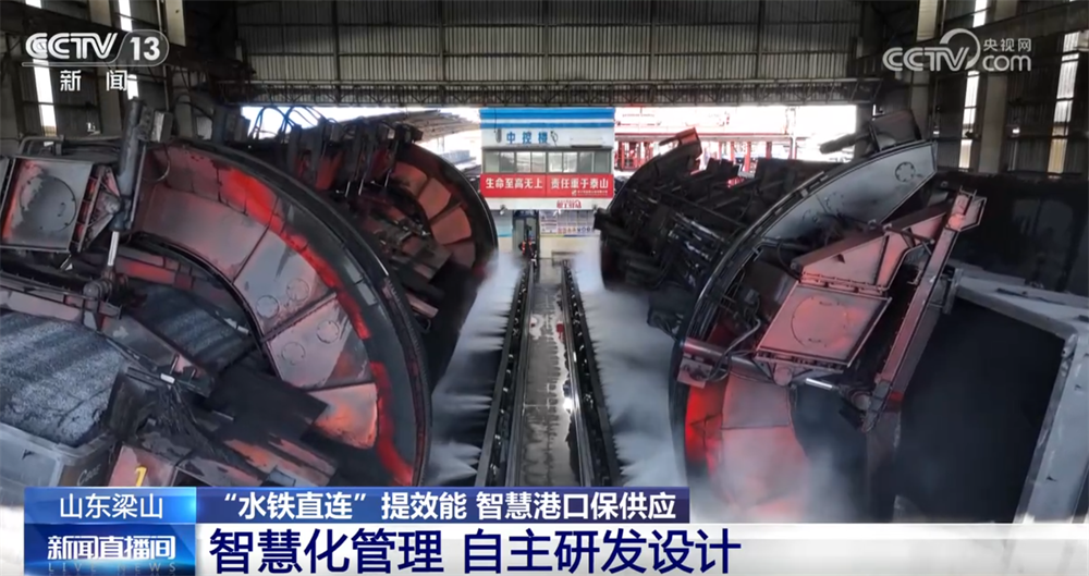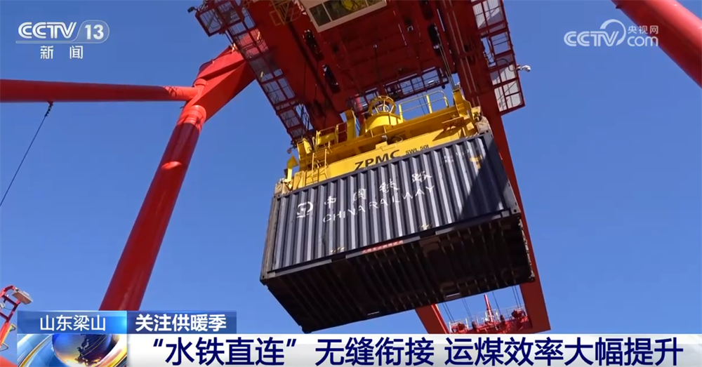 在現(xiàn)場(chǎng),大家可以看到大型起重機(jī)正在往船上裝集裝箱,這是今年港口新推出的一種“水鐵直連”的煤炭運(yùn)轉(zhuǎn)模式,就是把集裝箱的煤通過鐵路運(yùn)到這里,不再經(jīng)過卸煤和存儲(chǔ)的過程,而是通過精準(zhǔn)的需求調(diào)度把集裝箱直接裝船,通過運(yùn)河發(fā)往目的地。這種方式大幅縮短了煤炭運(yùn)輸?shù)闹芷?,把整個(gè)周期從5天縮短到3天,也提升了港口能源保障的效率和能力。