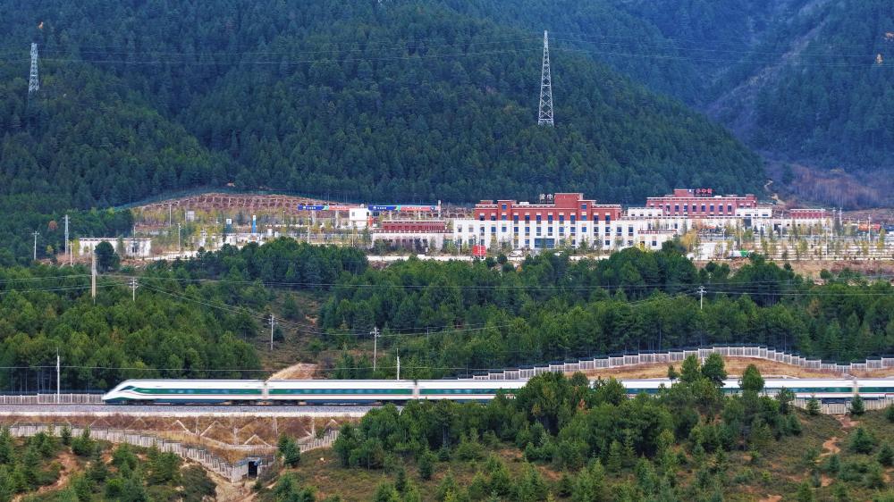 11月21日,一列動(dòng)車組列車駛過(guò)云南迪慶藏族自治州小中甸站(無(wú)人機(jī)照片)。