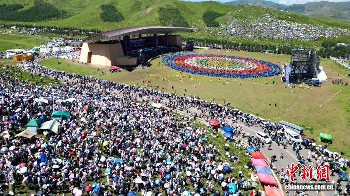 2024年8月4日,第22屆九色甘南香巴拉旅游藝術(shù)節(jié)在甘肅省甘南藏族自治州當(dāng)周草原開幕。圖為開幕式現(xiàn)場(chǎng)鍋莊舞表演。(資料圖)九美旦增 攝