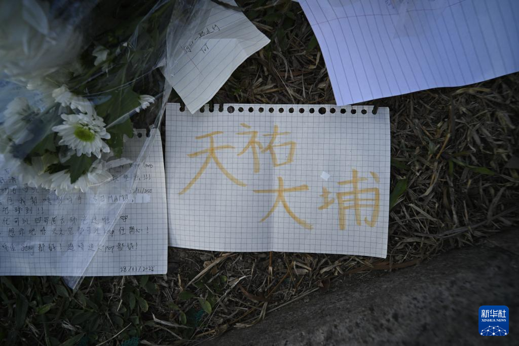 這是11月29日清晨在火災后的大埔宏福苑樓宇附近拍攝的市民擺放的花束與留言條。新華社發(fā)(王申攝)