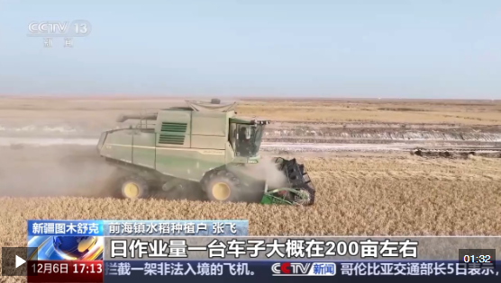前海鎮(zhèn)水稻種植戶 張飛:一臺(tái)車子日作業(yè)量在200畝左右,4000畝水稻大概在10天到15天之內(nèi)能采收完畢。