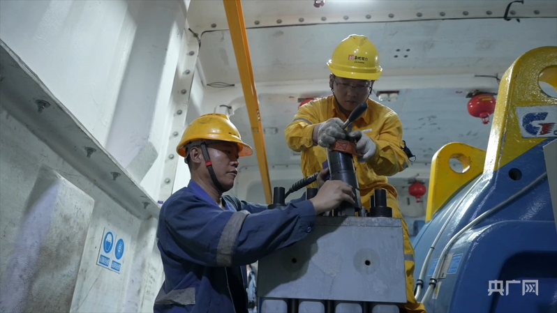 李亞雄與同伴對(duì)風(fēng)機(jī)內(nèi)部部件進(jìn)行巡檢維護(hù)(央廣網(wǎng)發(fā) 受訪者供圖)